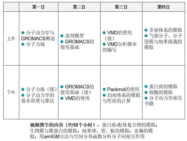本次培训涉及的大部分程序最佳运行环境是Linux系统,为确保学员都能顺利运行它们,在培训前会统一发布安装教学视频,使只会用Windows的学员也能顺利通过虚拟机安装培训用到的各种相关程序,如GROMACS、AmberTools等。没用过虚拟机的学员切勿担心在虚拟机里运行速度迟钝,Linux虚拟机和实体Linux系统运行速度相差不超过15%。另外,我们也会向学员提供我们编译好的支持GPU加速的Windows版GROMACS,使得不习惯用Linux的学员也可以在Windows下顺利做动力学模拟。对于使用Mac系统的学员,我们无法在安装程序方面提供任何帮助。